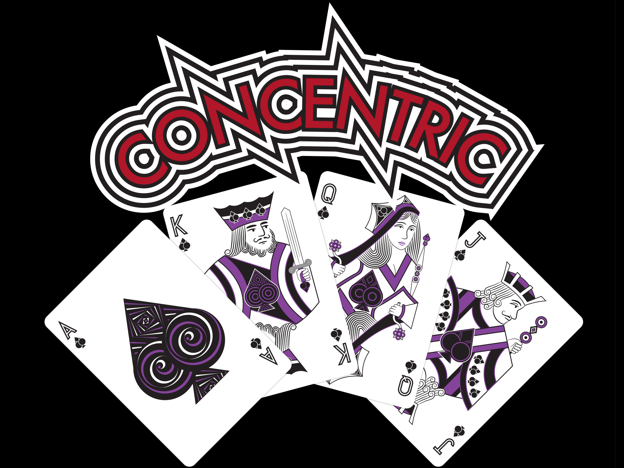The pips on each card are unique to that card. Using a number of layered, concentric shapes equal to the value of the card to make up each pip. For example, the clubs pip is made up of three circles and a triangle. The 6 of clubs uses 6 concentric circles in each of the three circle spots. It’s not exactly practical to count the number of circles on each card, but the effect is there to provide a quick visual shorthand to reinforce the value of the card.