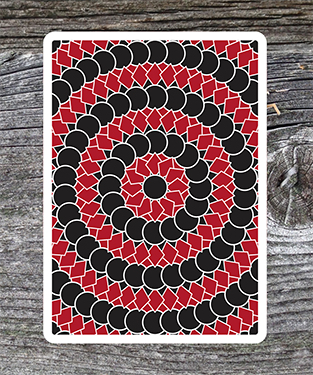 The back design uses the elementary shapes that make up each pip to create a concentric, radial pattern.